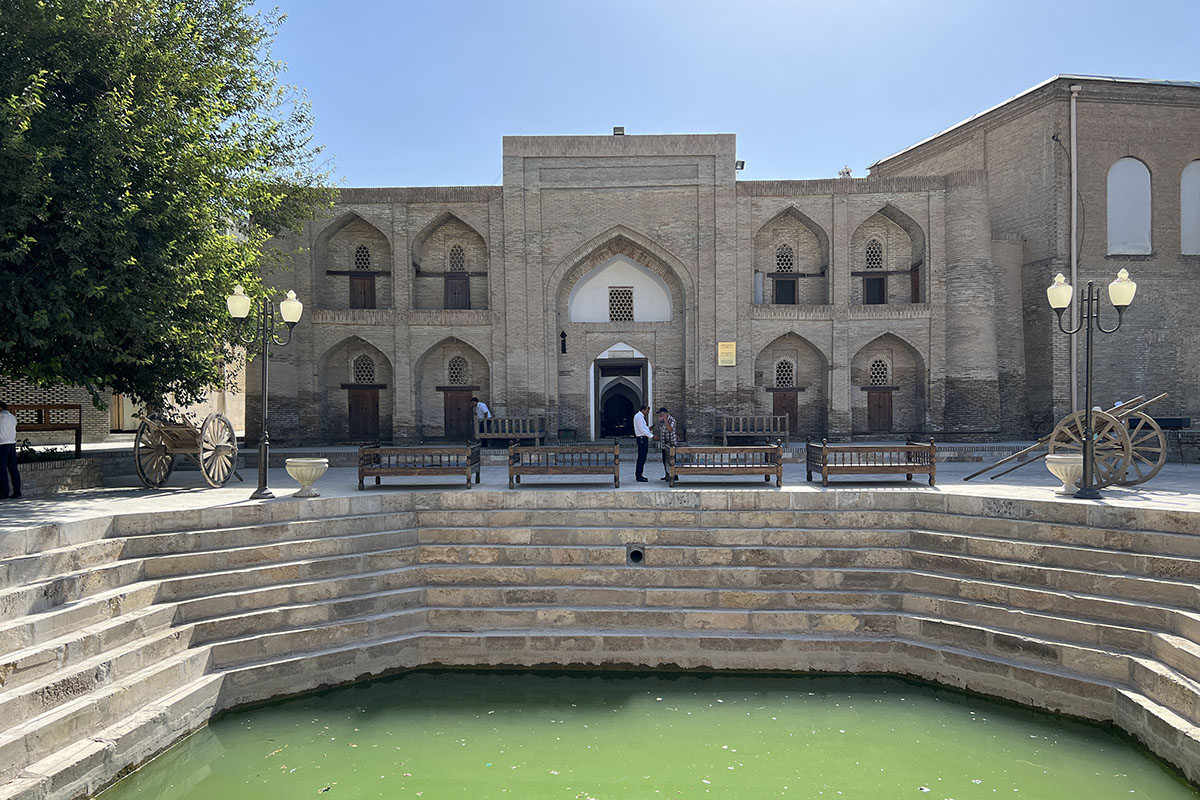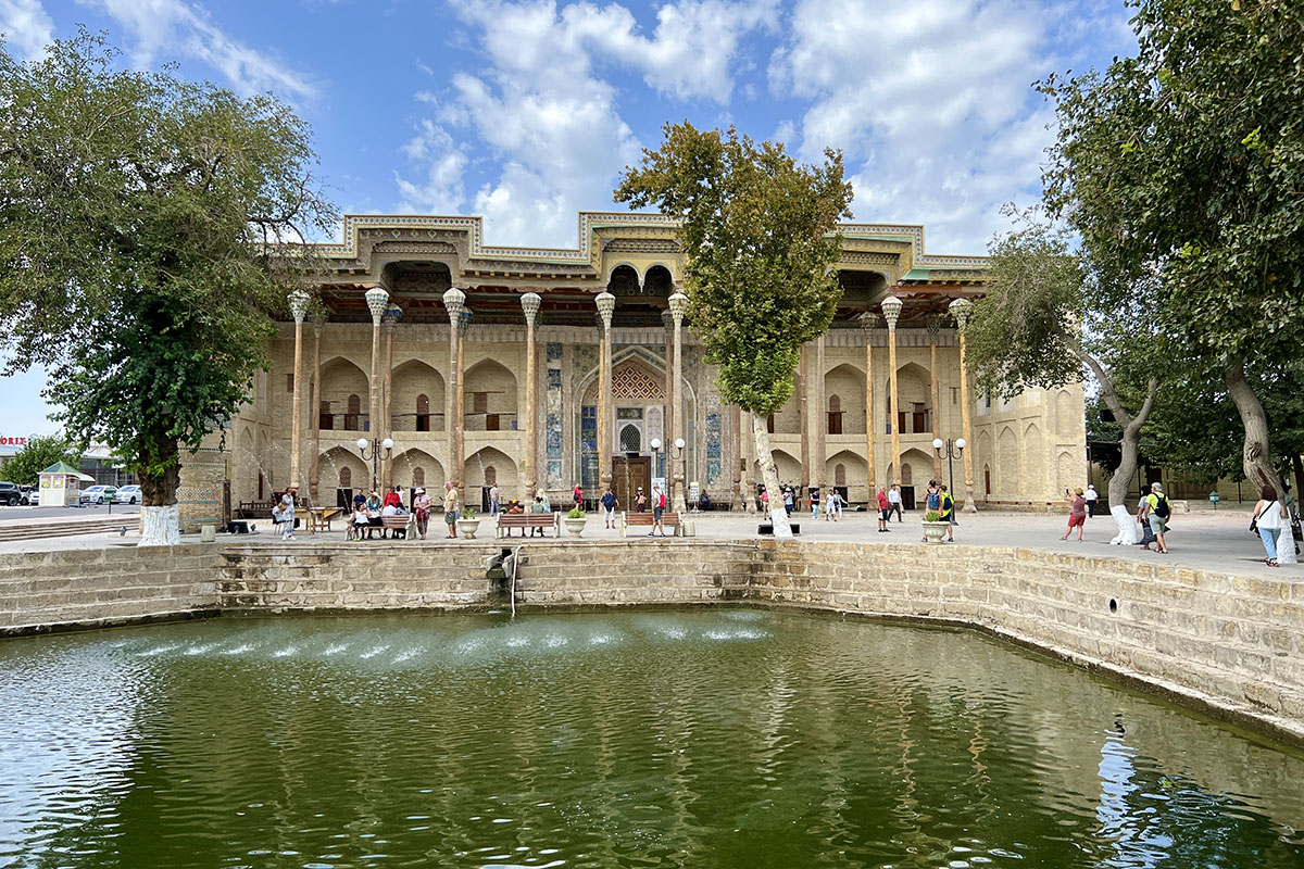 The khanaka’s location near one of Bukhara’s remaining water reservoirs (hauz) adds to its picturesque setting.